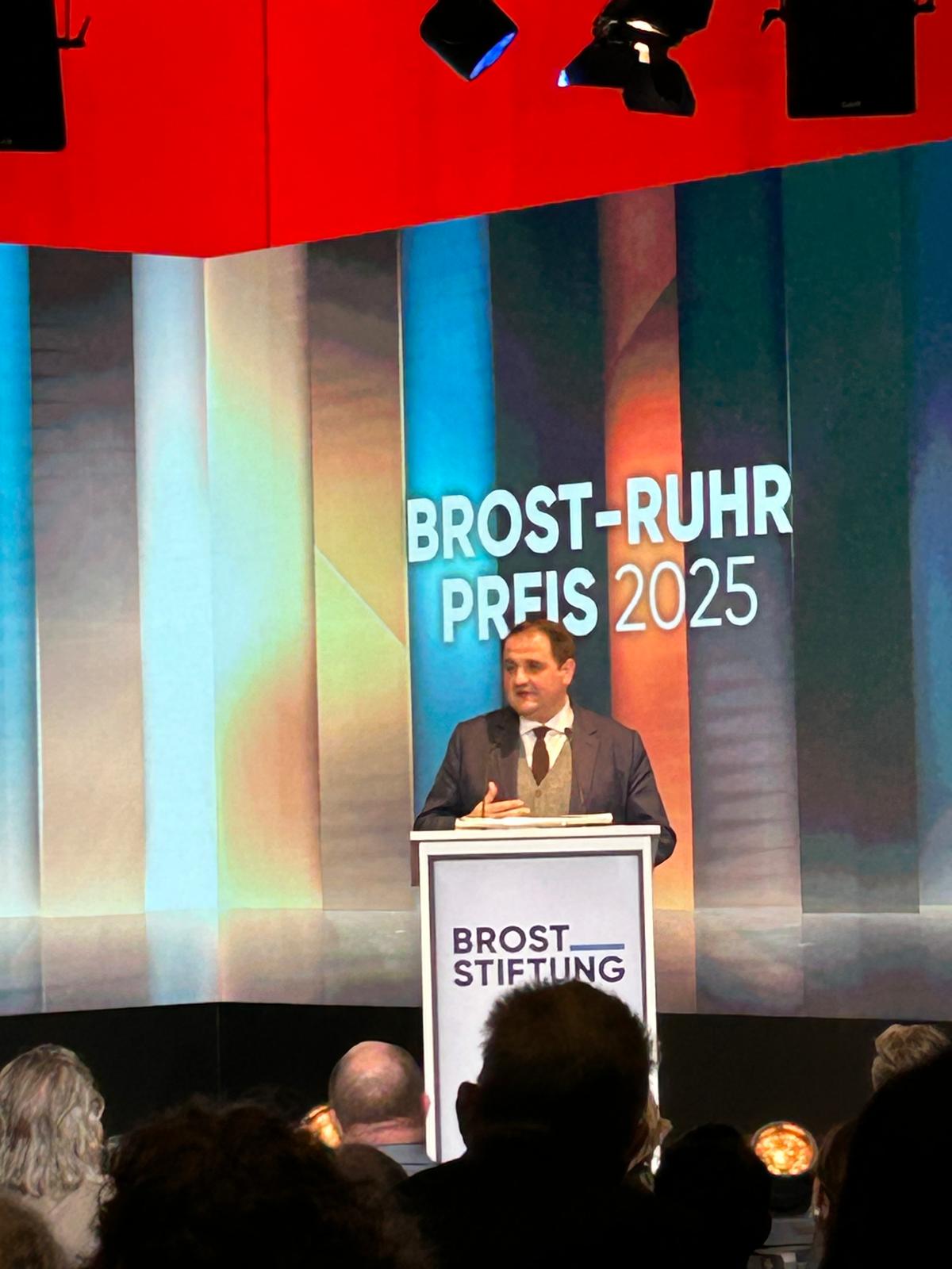 Die das Ruhrgebiet mit der Welt verbinden Boudewijn Simons (CIO Rotterdam) und Markus Bangen (CIO Duisburg) sind mit ihren Häfen zentrale Drehscheibe der Wirtschaft und auch der Energiewende! „Zwei Häfen - Ein Organismus „ Der Vorstandsvorsitzende der Brost-Stiftung Prof. Bodo Hombach würdigt die Preisträger als tatkräftige Brückenbauer für ein vereintes Europa. Unter den hochrangigen geladen Gästen aus dem Ruhrgebiet und den Niederlanden ehrte die Brost-Stiftung die beiden Preisträger für ihr Schaffen mit einigen Video Einspielern, sowie einer Laudatio von Herrn Minister für Bundes-und Europaangelegenheiten und Chef der NRW Staatskanzlei Nathanael Liminski, in Vertretung für den Ministerpräsidenten Hendrik Wüst.